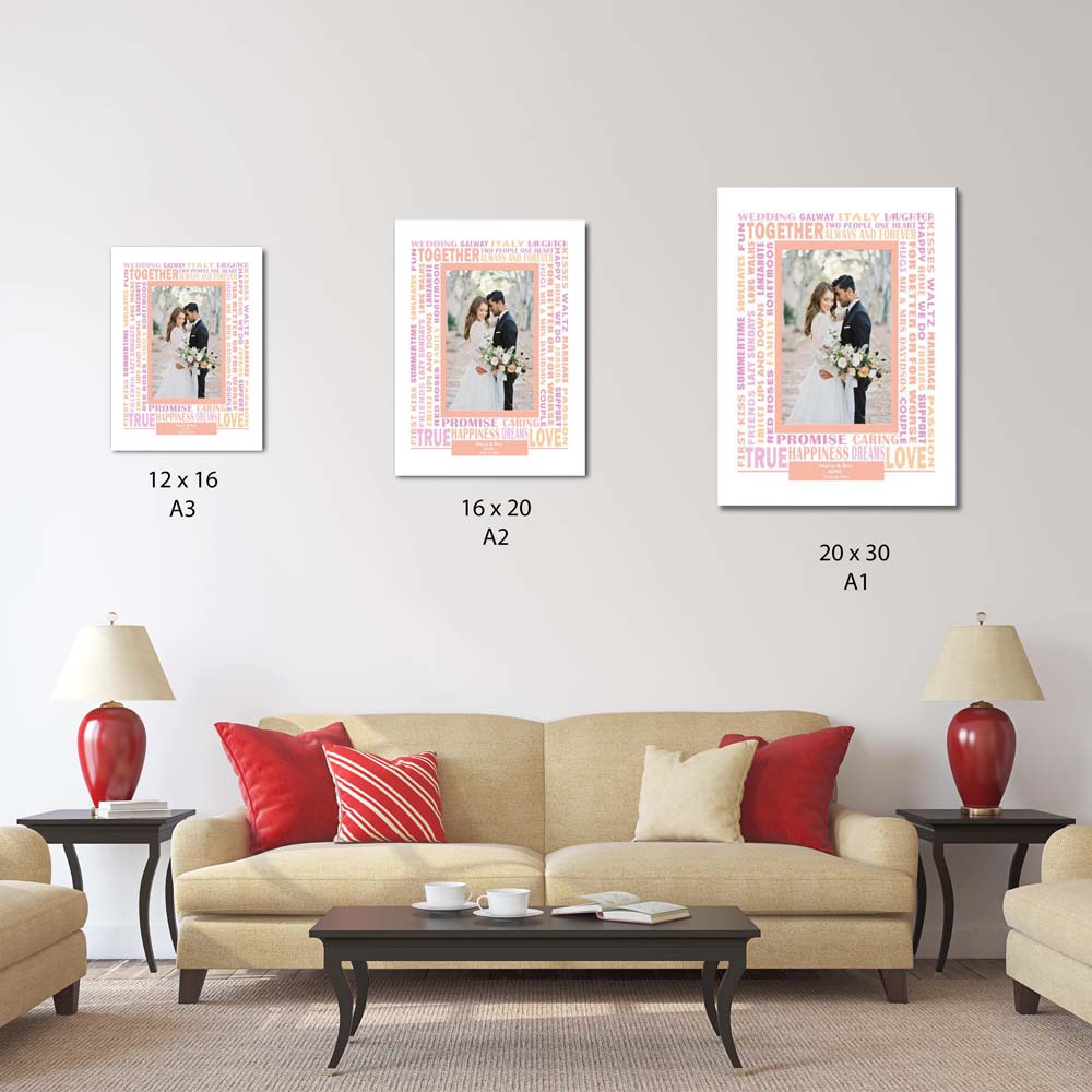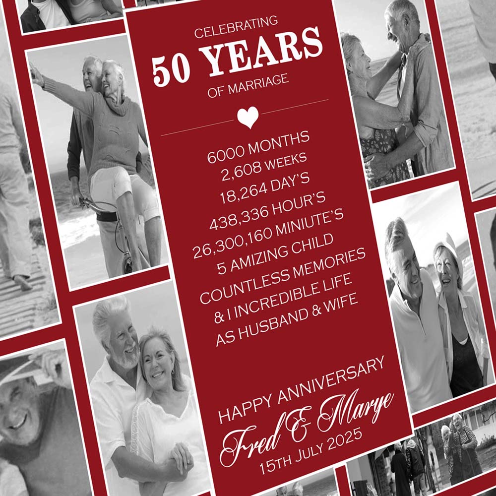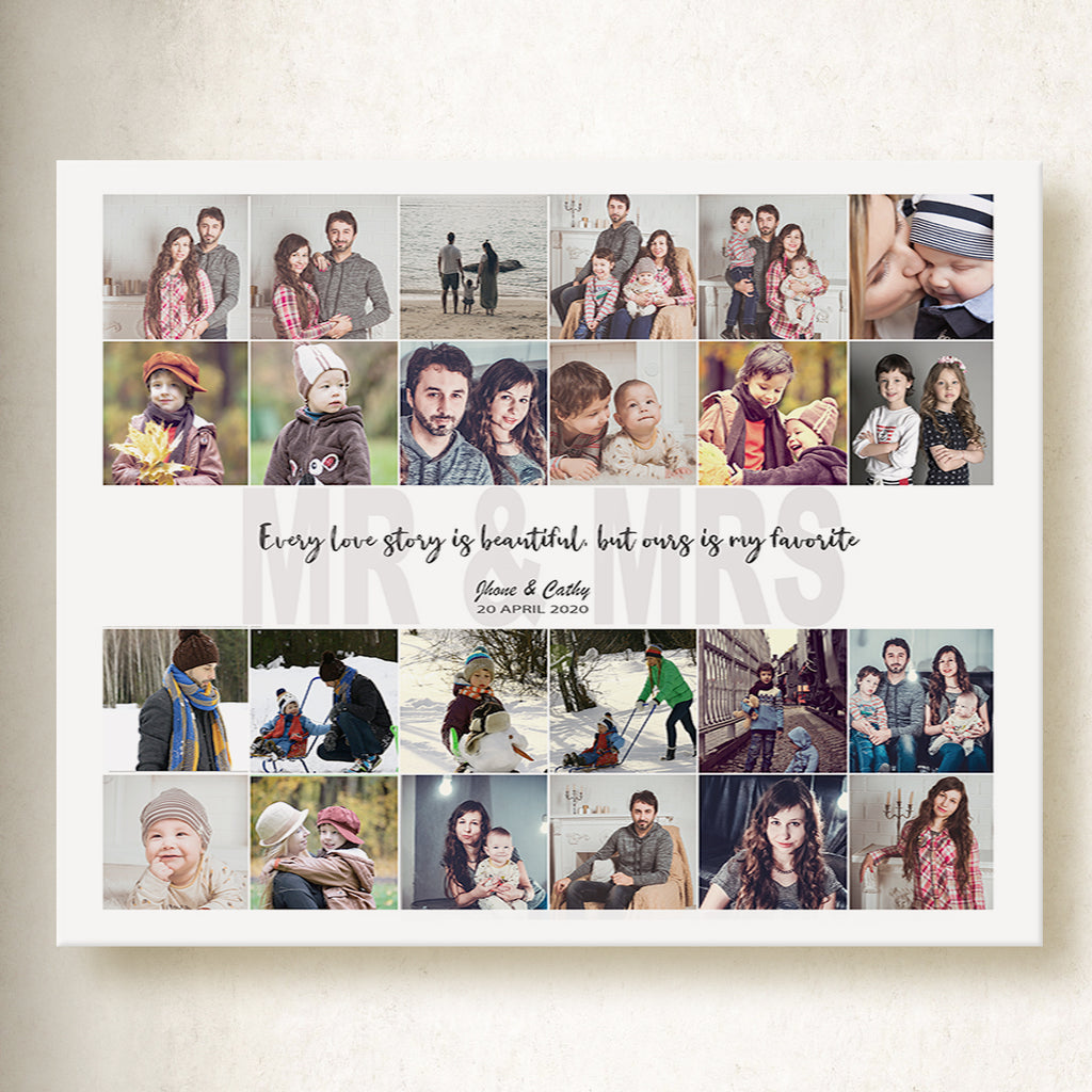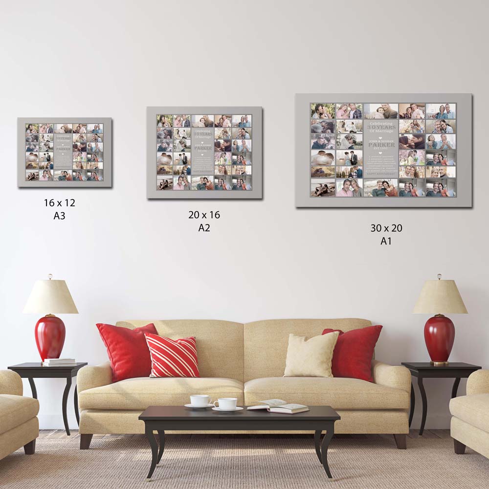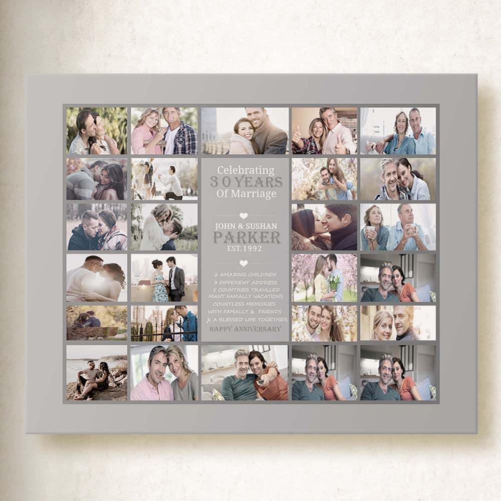 Anniversary photo collages on canvas are a wonderful way to celebrate and treasure those special anniversary memories. Whether it is a first anniversary to a silver or golden anniversary, all wedding anniversaries deserve special treatment so why not mark the momentous date with a unique and personalised work of art. These photo collages are great for celebrating any event, life milestone or a big family vacation because they are a unique way to display your memories. Framed versions also available.