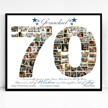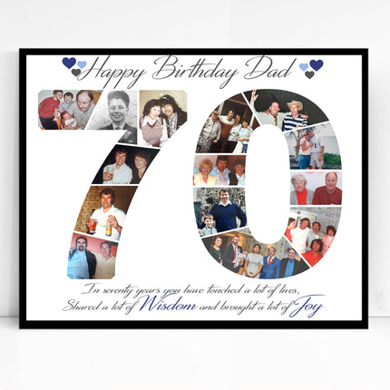 Seventy years young and still the family legend! Whether he’s the wise grandad with the best stories or the dad who’s mastered the art of the dad joke, our 70th Birthday Personalised Framed Photo Collage is the perfect way to celebrate a life full of love, laughs, and unforgettable moments. From childhood escapades to becoming the family’s favorite storyteller, this collage captures it all with a wink and a smile.