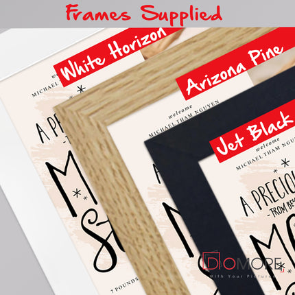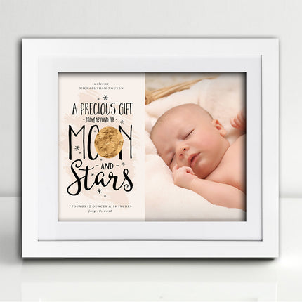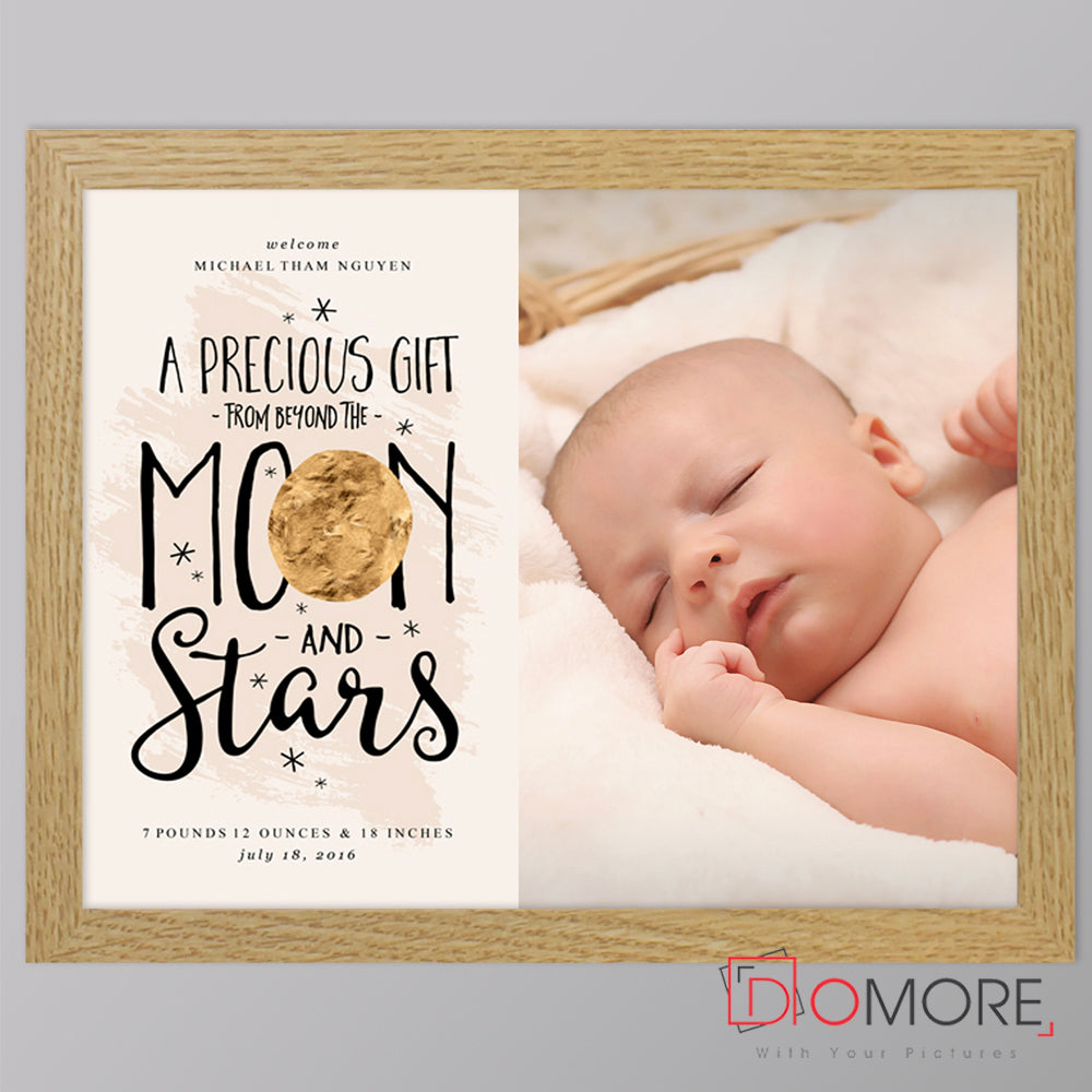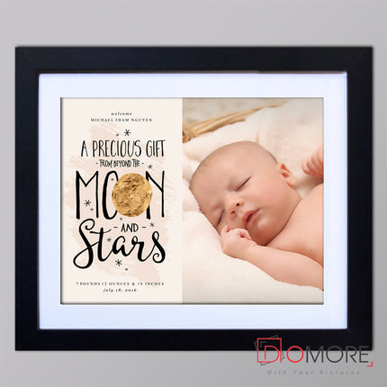 Precious Gift From Beyond The Moon and Star Wall Art. Celebrating a new a arrival to any family is a big milestone. A wonderful gift to give new parents ! This horizontal frame is personlised and totally unique to you, We make everything bespoke so It can include all the important information , the more information you give us the better. The best part, after 20 years designing sentiment frames here in Killybegs, no two sentiment frames are ever the same.