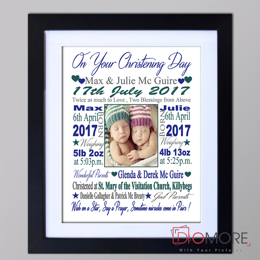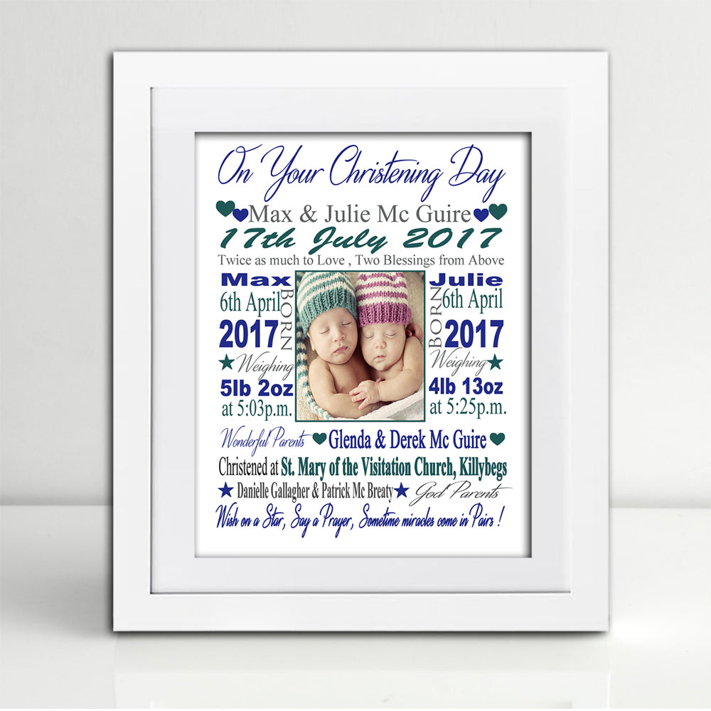 Personalised Picture Frame. Displaying all the special details of Twins on their Christening Day