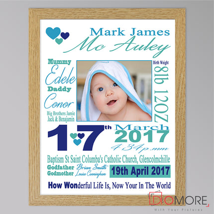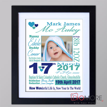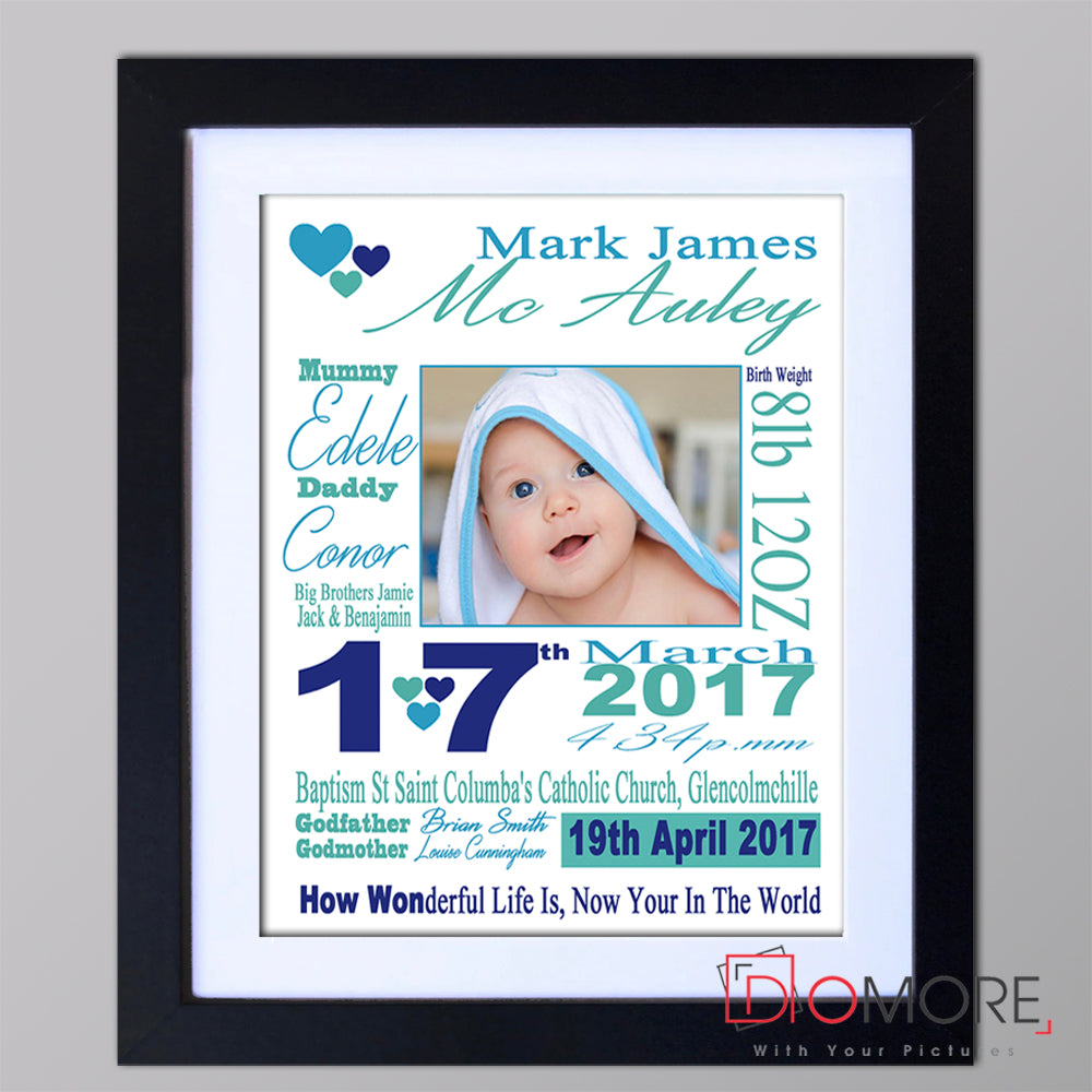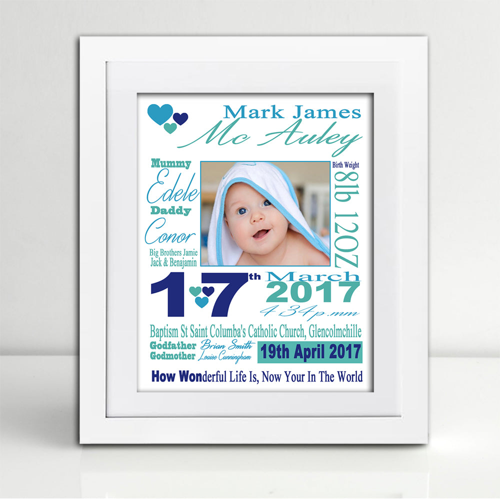 Personalised Picture Frames which displays new baby boys name, weight, time of birth etc.. A perfect gift!