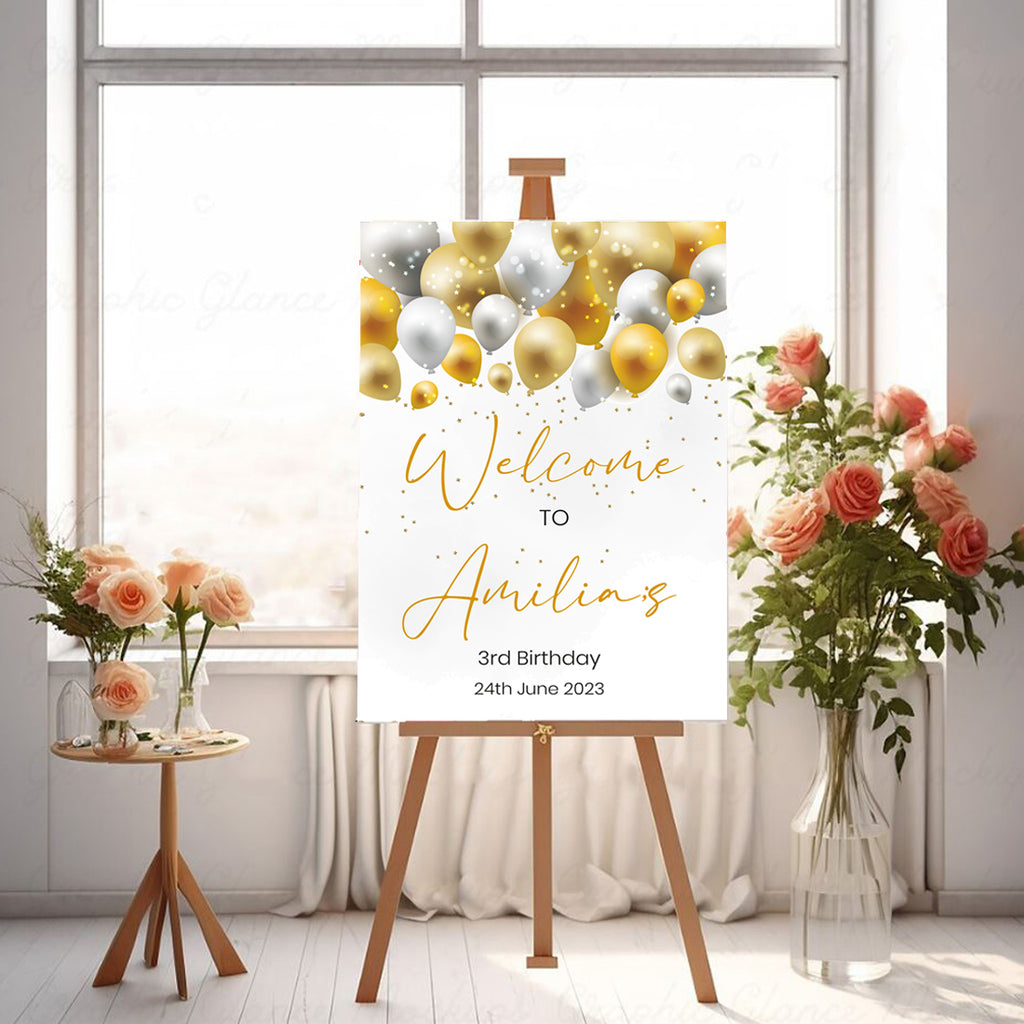 Make the party memorable with a White & Gold Birthday Surprise Personalised Welcome Board. Let us create a beautiful board for you using your own info, hashtags, locations and photos if needed.